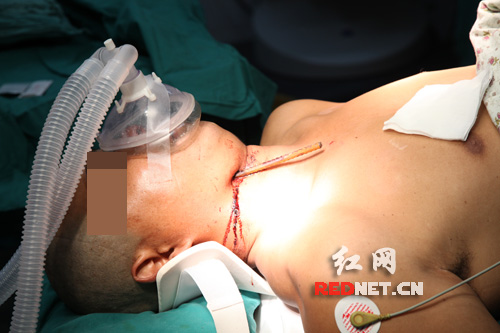24日下午3点,黄勇被顺利送到湘雅医院急诊科。当记者在急诊科看到患者时,还可清晰地看到插入头部的钢筋一端从下颌处裸露出来,脖子以及直径大约1厘米的螺旋钢筋上还印着斑斑血迹。他神智清楚,不时露出痛苦的表情,还有些躁动不安。