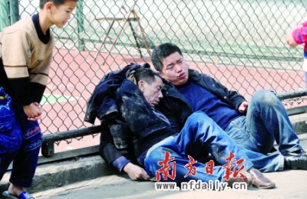 昨日上午11时30分许,老人的儿子赶到了现场。“我爸呢?”他像疯了一样哭着跑进地下通道,抱起已经死亡的父亲跑出通道,然后到一个篮球场边放下。他双手发抖,朋友给他点了根烟,然后,他狠狠抽了几口烟,又把父亲靠在篮球场边的铁丝网上。