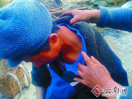 经过一个多钟头的山路,记者走进了刘树祥家。刘树祥正坐在院子里,用呆滞的目光看着记者进来,显得十分的麻木和无奈。提起刘树祥的病,妻子周世银哽咽着说:“以前他壮得像头牛,什么重活、累活都是他干。现在连走路都成问题,上床都要人搀扶,说个不好听的话,他就像一个‘活死人’!”