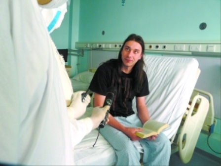 正聊着,护士长举着相机跑过来:“您看,这是20号病房的德国小伙儿刚和咱们护士的合影。”照片上,小伙子高大、英俊,长长的披肩发,笑容灿烂。我赶紧来到20病房,德国小伙儿正在看书。因为他对中文一窍不通,我英语也不灵,所以我们只好通过来查房的宋蕊医生的翻译进行交流。