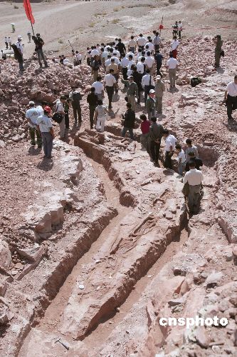 八月二十六日,中科院古脊椎动物与古人类研究所的科研人员,在位于新疆昌吉回族自治州奇台县的恐龙沟,挖掘出一具蜥脚类食草恐龙化石。据现场专家测量,其体长达三十五米左右,与一九八七年,距该挖掘点一百多米之外的山上挖掘出土的恐龙同为马门溪龙,但比一九八七年挖掘的恐龙还要长五米,成为名副其实的“亚洲第一龙”,同时该恐龙的脖子长约十五米,是迄今为止世界上脖子最长的恐龙。中新社发 刘新 摄