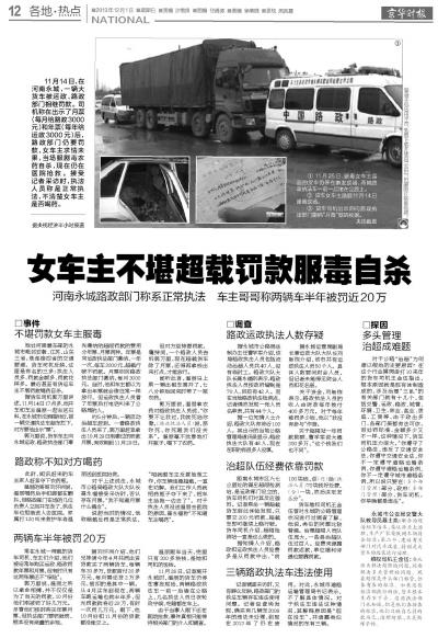 11月14日,河南永城一辆大货车因超载被当地运政、路政部门相继罚款。当事女车主刘温丽因付不起罚款喝剧毒农药自杀,后经抢救脱离危险。
