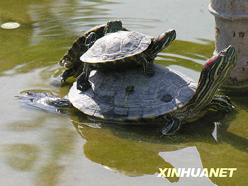 图:巴西龟放生池内“叠罗汉”
