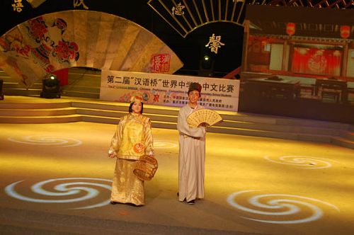 复赛场上,展现在人们眼前的是一场精彩绝伦的中国文化传统文艺演出。有场景话剧、小品、歌舞等,突出体现了中国悠久的历史和灿烂的文化。特别是马队表演的场景话剧《趣说三打白骨精》,令所有在场的观众拍手叫绝,外国学生们居然能用流利的中文和形象的表演把中国名著《西游记》中的人物演绎得惟妙惟肖,最逗人的是,还配上了现代西洋音乐和时髦口语,使角色变得生动形象有趣。