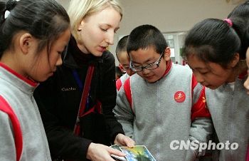 12月7日,2009年“汉语桥——美国中小学校长访华之旅”代表团首次来闽交流访问。70名代表中,33名代表来福州参观访问,37名赴厦门参观访问。图为美国科罗拉多学院代表正与福州实验小学学生交流,介绍美国风景。据了解,近年来,美国开设汉语课程的中小学大幅增加,已由2005年的263所增至2009年779所。汉语已经成为美国外语教学中发展最快的语种。(中新社/张丽君 摄)
