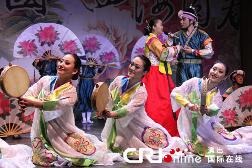 由中国国务院侨务办公室、中国海外交流协会主办的“文化中国·四海同春”访欧艺术团巡演24日晚在布鲁塞尔圣米歇尔剧院成功演出。为比利时华侨华人奉献了一场精彩的民族歌舞晚会。图为朝鲜族歌舞表演。