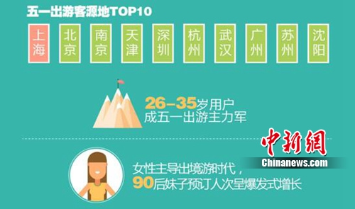 途牛旅游网监测数据显示,截至目前,上海、北京、南京、天津、深圳、杭州、武汉、广州、苏州、沈阳等地用户预订五一行程人次较多,26-35岁用户成五一出游主力军。此外,随着女性主导出境游时代的来临,90后妹子预订人次呈爆发式增长。