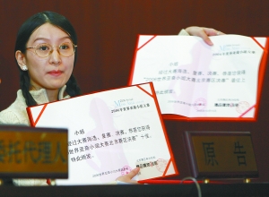 昨日,杨雪在法庭上出示“亚裔小姐大赛”的获奖证书,称上面没有美国方面的印章。 张涛 摄