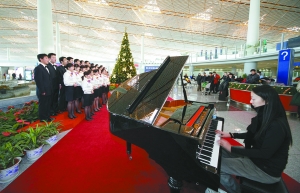 昨日(12月25日),首都机场3号航站楼内,旅客在合唱团伴奏下跳舞。当日,机场在2、3号航站楼增加“文化国门”系列演出,30名机场员工组成的合唱团参演。机场负责人表示,2009年起,每逢重大节日、旅客进出港高峰期,机场都将邀请外界演出团体或发动内部员工表演等,为旅客提供文化表演。(李立强 通讯员荆雷 摄影报道)