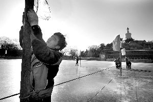昨日上午,北海公园开始在湖面上“圈地”造冰场,公园负责人表示,北海今年开放的冰场区域将为近年来最大,共3000多平方米。准备工作将于月底前结束,待相关检验合格后,冰场将于元旦前后向游人开放。(薛珺 李立强 摄影报道)