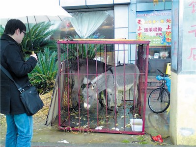 一个大铁笼,两头瘦弱的小毛驴,旁边是一块写着 “活杀现做驴肉”招牌。昨天上午,当这样一幕情景出现在浦东新区樱花路上一家酒店门口时,惹来众多过往居民的非议,并质疑其是否具有卫生防疫等证书。不过,酒店经理在接受采访时却表示,所谓“活杀现做”只是一个噱头,目的是为了吸引更多食客。