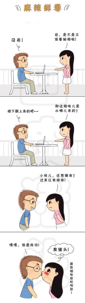 简单的手绘线条,着上粉红粉蓝的暖色,配以搞笑的对话,充满“麻辣”、令人捧腹的爱情生活就活生生地展现在众人眼前了。