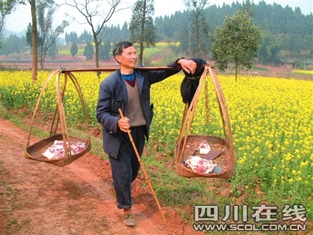 “割肉哟——”上午11点钟,菜花丛中飞出抑扬顿挫的声音。循声追去,见一盲人挑着肉担,拿着竹竿在乡间小道上边摸索前行,边高声吆喝。“他就是杨中模!”村民说。