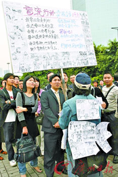 漫画家名为黄达冲,在天河体育中心南门广场举着一面与他身高差不多的铁牌,上面展示了他的“三国英雄前传”漫画以及他的宣言:“盲流行动·卖稿卖身一千万……”他一身牛仔套装上前身后背也贴着多张漫画作品,引得路人围观。何谓“盲流”?他解释道,他是南宁人,来广州十年,做过出版和媒体工作,现在快40岁了,还没找到方向,所以认为自己是盲流。“我去年11月开始创作‘三国英雄前传’,现在完成了一半,今天来到这里想找人投资。如果有诚意的话,私下谈价钱……一千万嘛,不一定是人民币。”在旁边还有一位长发壮汉,是黄达冲的“哥们”,也是一位“自由艺术家”,正帮着他派传单。