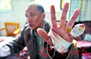 除了手被砍伤以外,洪叔的腰部也被划伤,走路时一瘸一拐。回忆前晚发生的事情,洪叔和美姨都很后怕。洪叔说,当晚8点50分,美姨到洗手间冲凉,厅里只剩下他一人。十分钟后,洪叔突然看到两个身影闪进院内,还没有等他反应过来,一名男子捂住他的嘴巴,拿着西瓜刀说,“不要动,再动就捅死你!”另外一名男子则在屋内到处翻找,洪叔拼命地挣扎反抗。