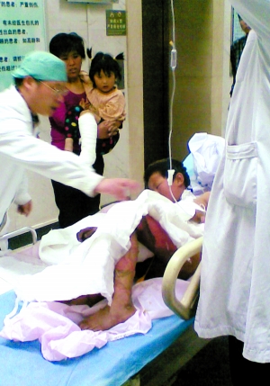 昨日上午11时许,积水潭医院抢救室,烧伤最严重的男孩躺在担架上,不停地喊疼。其身体多处脱皮,全身水肿。旁边,已经包扎好左腿的妹妹依偎在母亲怀里。随后,警方将伤者全部转往右安门医院。