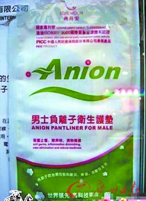 原来,这款雷人产品的全称为“男士负离子卫生护垫”(见右图),为香港一家公司制造,为国内首创。卖家介绍,男士护垫从包装来看与女士差不多,也是撕揭式,但比女士的更长更大些,“很薄的,表层还是柔棉层,使用时几乎没什么感觉”。