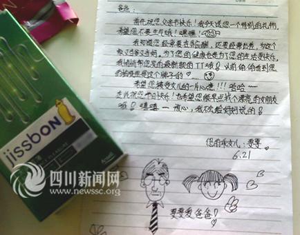 文中这样写道:“首先祝您父亲节快乐,我今天送您一个特别的礼物,希望您不要生气哦!知道您经常在外应酬,还要经常出差,为这个家又当爹又当妈。为了您的健康也是为了您的生活更快乐,我悄悄帮您买的最新款的TT哦!以前偷偷看到您的抽屉里是这个牌子的……”言语中,透露出女儿对父亲的感激之情。最后,女儿还俏皮的说“希望您接受女儿的一片心意!!!哈哈……在此祝您节日快乐!也希望您能早点找个漂亮的女朋友哦,嘻嘻……放心,我不会给妈妈说的!”小女孩通篇用语朴实无华,天真无邪,读来让人感动。