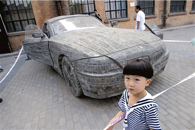 昨天,在798创意广场,一辆利用青砖、水泥和钢筋建造的“宝马”引来游客们的赞叹。