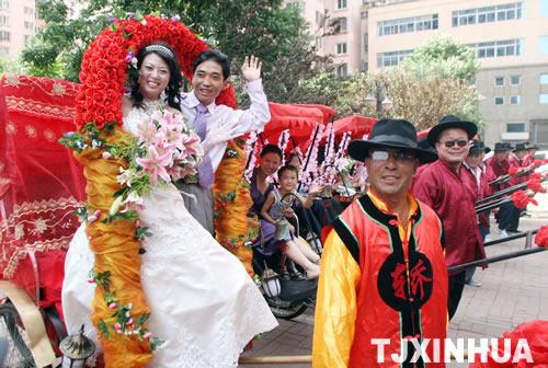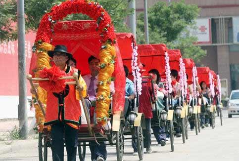 6月28日是新郎崔国卫,新娘高颖结婚的日子。追求个性的的新人雇佣了10辆黄包车作为自己的婚车,同时载着亲朋好友们逛鼓楼、游海河,感受城市的变迁。(刘东岳摄)