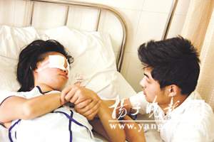 在医院眼科抢救病房里,记者昨天下午见到双眼蒙着纱布、躺在病床上的小雨,她双手拉住坐在一旁的丈夫不愿松开。据小雨的丈夫梁伟介绍,他与妻子是在常州打工时认识的,两人于2007年年底结婚,在结婚前,妻子就知道他有一个患精神分裂症的弟弟。