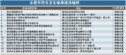 记者昨日从深圳市卫生局获悉,该局对深圳71家游泳场所水质进行专项抽样检验,有15家水质不符合卫生标准,其中竟有一家四星级酒店和两家知名五星级酒店所属的游泳设施。