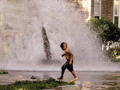 2007年7月16日,在威斯康星州的密尔沃基,人们私自打开了一个消防栓,用以消暑降温,而小朋友更是玩得不亦乐乎。美国的天气越来越热,而人们也想出更多的招数来避暑。