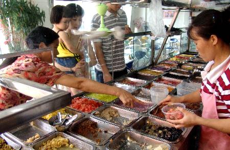 夏日炎炎,各种防暑降温的饮品、小吃销售火爆,为人们带来了丝丝凉意。图为几位消费者在一家冷饮店内选购闽南传统防暑降温饮品四果汤。