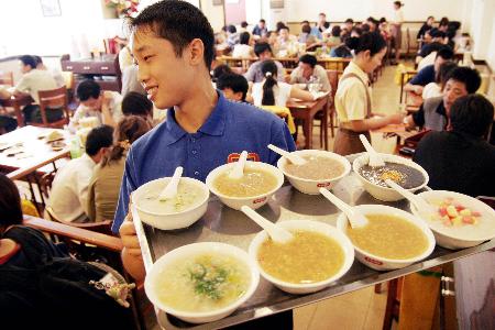 连续数日的高温天气使得京城的冰粥等消暑降温食品销量大增。图为北京一家粥店的服务员手托装满各种冰粥的盘子。