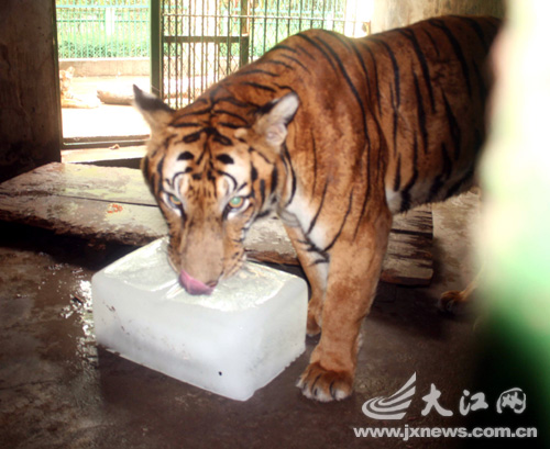 南昌市动物园,老虎正抱着大冰块。“天气太热,每天都要消耗近600公斤冰块为5只老虎降温。3只大象每餐也要吃掉约75公斤西瓜。”饲养员说:“河马喜欢泡在水池里,熊猫则躲在空调房里惬意地打着盹,大象、斑马忙着啃西瓜”