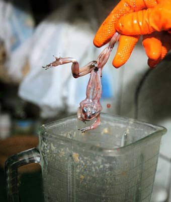 在秘鲁首都利马,商家将活生生的青蛙扔进榨汁机,辗成肉泥,供顾客饮用。据称,这种“青蛙汁”在当地的工薪阶层中十分受欢迎,很多人坚信这种“饮料”能够强身健体,解除疲劳,甚至对性功能低下也有神奇的治疗效果。
