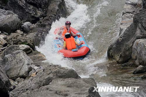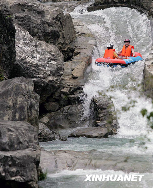 7月26日,一对男女在参加相亲交友为主题的漂流。当日,湖北宜昌一网站的相亲交友频道组织10对男女来到长阳土家族自治县兰草谷漂流,让他们在漂流运动中加强合作,增进了解,找到心仪的朋友。新华社发(王永胜 摄)