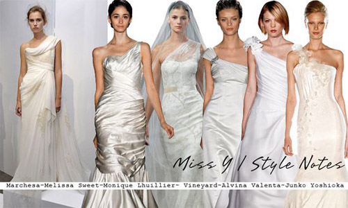 Marchesa薄纱单肩拖地裙,把模特们装扮地好似雅典女神。单肩婚纱或收腰,或在裙摆出收紧,突显身段。通常在单肩处有装饰,如重叠薄纱,花朵装饰物,珠宝亮饰等等。想要秀出肩部线条的新娘选择单肩婚纱为佳,如女神般朦胧神秘又权势高贵。