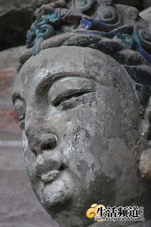 千佛寨摩崖造像分布南北两岩,周长约1000米,有造像3061尊,是安岳石刻单处造像最集中的地方,向有“雕刻艺术陈列馆”之称。其中最吸引人的要数56号窟的“高冠观音”造像,具典型的盛唐石刻风韵,头戴镂空花冠,胸饰璎珞,体态略呈“S”型,腰身轻拧,双眸微阖,一抹微笑若有若无,体型上有极其曼妙的曲线美,气质上则有人将其称为“东方蒙娜丽莎”。著名美学家王朝闻说,这是他所见到的最美的唐代观音造像。这一份美,缘于安岳古工匠创造性地将人间少女的动感身姿融合而入宗教造型,美就有了生活性、贴近性和突破性,跳出平庸,直指人心。