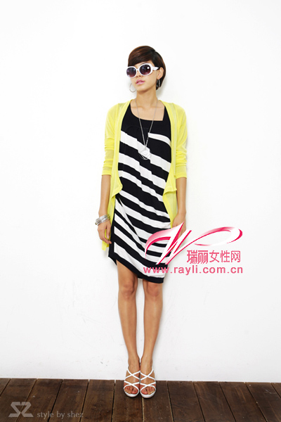 黄色针织燕尾针织衫+斑马斜纹长衫