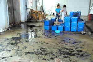 一跨进消毒车间门槛,扑面而来的是刺鼻臭味,地上大片蓝黑色的污水令人作呕。除了三两个负责清洗的女工戴着胶皮手套,其他十几个工人都没穿工作服或是佩戴口罩、手套,负责清洗的女工说:“不戴手套,火碱刷碗烧得手疼”。