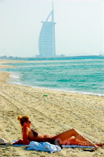 比基尼女郎在七星酒店的沙滩上晒日光浴。