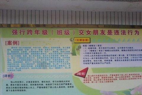 《跨年级交女朋友是违法行为一中学的宣传板雷倒网友》,近日一则热帖在各大论坛流传,帖内附有一张照片,并介绍,图中是某中学的宣传板,宣传板上标明“强行跨年级(班级)交女朋友是违法行为”,并表示有法可依。网友纷纷被“雷”倒,“交本班女朋友就不违法了么?”“早恋不好,但违法吗?”网友们觉得太滑稽。也有网友因“太滑稽了”而质疑真假,发帖请PS高手鉴图,“希望这不是真的,否则真要被雷翻。”