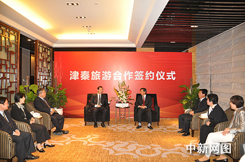 “同处渤海湾,旅游一线牵”。同时,“津秦旅游合作签约仪式”在此间举行,天津市副市长任学峰、秦皇岛市市委书记王三堂出席签字仪式,为进一步促进津秦两地旅游业的对接和融合达成共识,进一步在旅游资源开发、客源共享、线路打造、旅游宣传促销等方面实现区域合作。秦皇岛市副市长李秦生与天津市旅游局副局长金铁林在合作协议上签字。