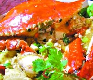 材料:花蟹1只、干葱碎10克、蒜蓉10克,盐、糖、原粒梅子(瓶装)、柱候酱、茄酱、鸡油各适量。