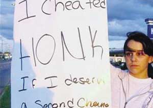 美国俄亥俄州曾对未婚夫不忠的女子洁西·杜特瑞,选择了一项十分“公开”的方式来表达她的忏悔。19岁的洁西近日站在一家超市的停车场外,举着一块牌子,上面写着:“我曾对未婚夫不忠。如果你们认为可以再给我一次机会,请按一下车喇叭。”牌子的另一面写着:“我真的很爱我的未婚夫。”洁西今年夏天时发生了出轨行为。她后来向未婚夫坦承此事。未料未婚夫一气之下收回了订婚戒指。洁西表示,她还会在周三晚举行一次“烛光守夜”。