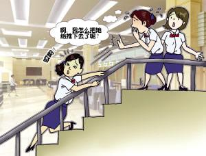 事情发生在昨日下午二时许。当时张丽和两名同事刚吃晚饭,从二楼走下一楼。到了楼梯拐角处,张丽无缘无故用力推了走在前面的同事一把,同事顿时翻滚在地,还好同事及时用手抓住栏杆,只是手脚有些擦伤。
