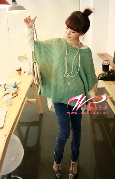 绿色超宽松毛衫个性十足,搭配蓝色紧身牛仔裤,让你甜美惹眼!