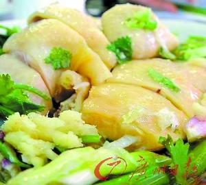 这里的白切鸡个头都比较大(可能是-鸡的缘故),其吃法也与其他的白切鸡不同,用姜葱铺面,而非用传统姜葱末蘸着吃,显得更加豪气——据店家介绍,此靓鸡选材的范围非常窄,来料有限,在该店属于限量版发行,要吃美味就要动作快啦。