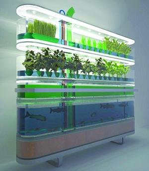 英国研究人员设计出一种新型厨房设备。它利用生态养殖技术让人一年四季、足不出户就可以吃到新鲜的鱼和蔬菜。