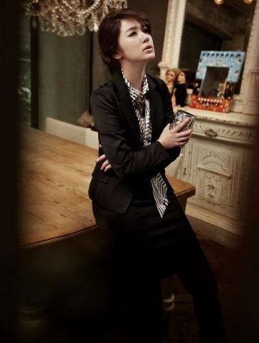 时尚点评:一袭黑色的ol时尚套装,稳重中不失优雅,内搭的黑白配衬衫非常抢眼,特别的条纹非常sharp,优雅的盘发展现尹恩惠的轻熟魅力!