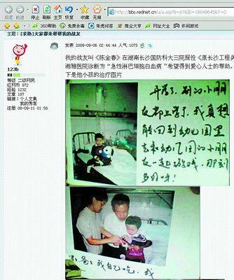 “我的战友叫陈金春……三级士官转业,现在他的小孩被……诊断为‘急性淋巴细胞白血病’希望得到爱心人士的帮助。”今年9月6日,战友在某网站论坛上为陈金春女儿发出求助帖。不少网友打电话咨询情况,并邮寄财物帮助小飞月。