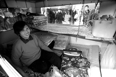人力“房车”内有上下铺,还有隔板放生活用品,母子三人走累了就停在路边休息,夜里也睡在车里。