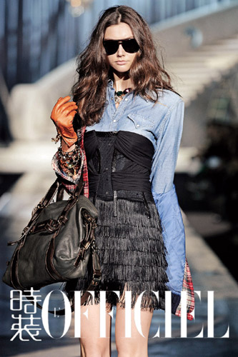 Diesel是牛仔潮流中当之无愧的明星,本季的造型是30年代的感觉加上Diesel颓废的街头美感,包括萝卜裤型的连裤装,膝盖重点打磨的牛仔裤,灵感来源于吊带袜的皮带细节,用牛仔打造出不一样的复古味道。Dsquared2本季将牛仔和嬉皮元素结合在一起,打造出别具一格的奢华街头嬉皮感,豹纹外套、镶钻腰带、恨天高鞋,Dsquared2依旧将牛仔玩得炉火纯青。