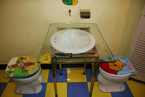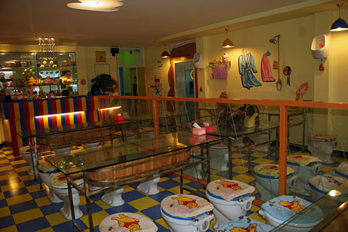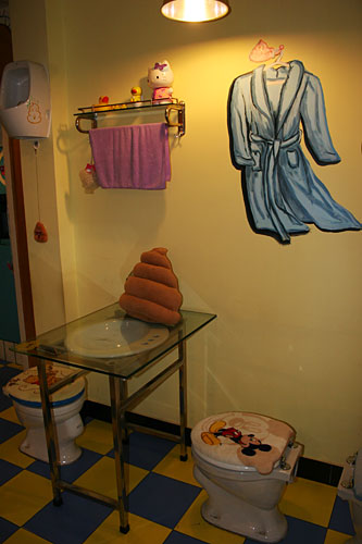 小小的门面,狭窄的楼梯。走上二楼后,这个布置得充满了童趣的餐厅才展现在食客面前。这里的每把座椅都是一座标准的冲水马桶。盛放主餐的不是盘子,而是微型马桶,冷饮则大都放在“蹲坑”形状的便器里。好在这些餐具造型卡通,并不会让人大倒胃口。